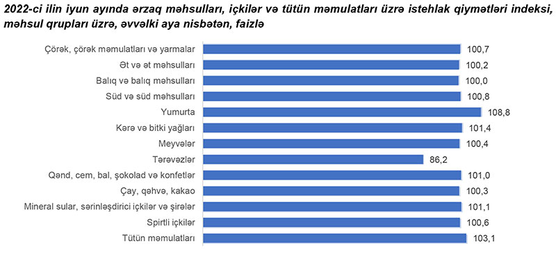 2022-ci ilin iyun ayında ərzaq məhsulları, içkilər və tütün məmulatları üzrə istehlak qiymətləri indeksi əvvəlki aya nisbətən 1 faiz azalıb, əvvəlki ilin iyun ayına nisbətən 20,6 faiz artıb.