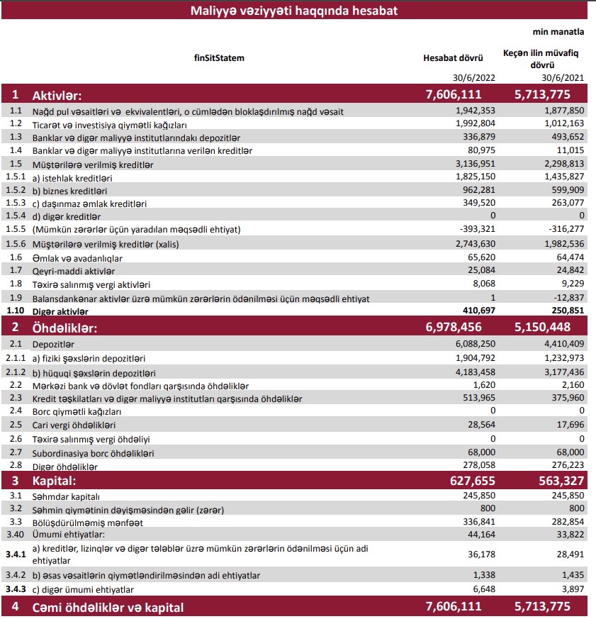 2021-ci ilin İyun ayının sonu ilə müqayisədə "Kapital Bank"ın cəmi aktivləri 1 milyard 892 milyon 336 min manat artaraq 30 iyun 2022-ci il tarixində 7 milyard 606 milyon 111 min manata, o cümlədən müştərilərə verilmiş kreditlər 838 milyon 138 min manat artaraq 3 milyard 136 milyon 51 min manata yüksəlib.