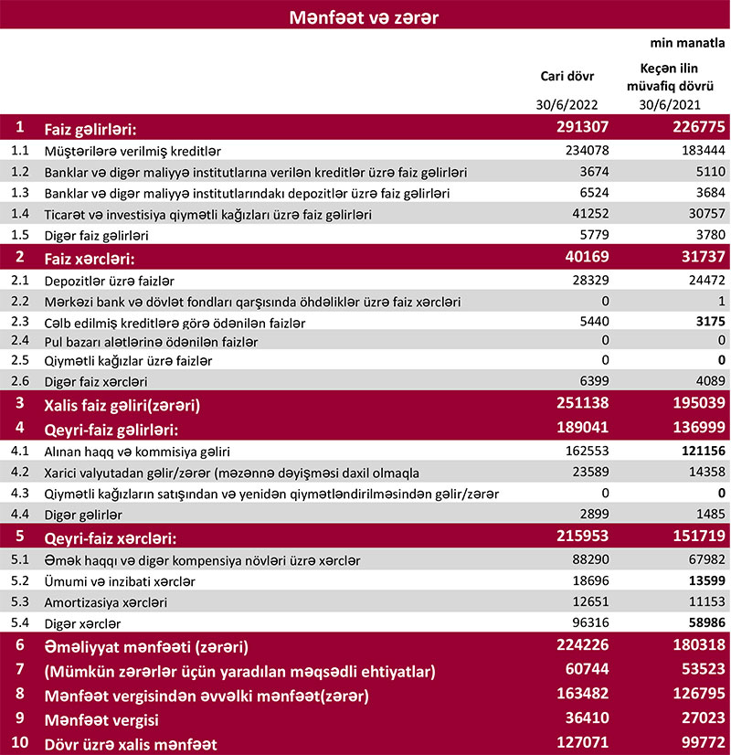 2022-ci ilin ilk 6 ayı ərzində "Kapital Bank" ASC-nin cəmi əməliyyat gəlirləri 480 milyon 348 min manat, cəmi əməliyyat xərcləri 256 milyon 122 min manat təşkil edib. Gəlirlər xərcləri üstələdiyindən Bankın 224 milyon 226 min manat əməliyyat mənfəəti yaranıb. Əməliyyat mənfəətindən 60 milyon 744 min manat mümkün zərərlər üçün yaradılan məqsədli ehtiyatlara ayırılıb və 36 milyon 410 min manat mənfəət vergisi ödənilib. Beləliklə, "Kapital Bank" ilk 6 ayı 127 milyon 71 min manat xalis mənfəət ilə bağlayıb.