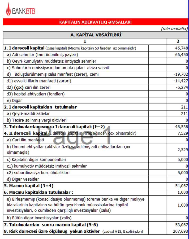 Qeyd edək ki, 2021-ci ilin birinci yarısında Bank BTB-nin cəmi əməliyyat gəlirləri 15 milyon 85 min manat, cəmi əməliyyat xərcləri 14 milyon 977 min manat, əməliyyat mənfəəti 108 min manat təşkil etmişdi. Ehtiyatdan azad olmuş 430 min manat hesabına mənfəət 538 min manata yüksəlmişdi.