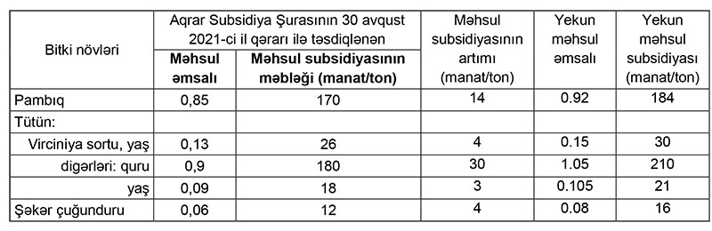 Aqrar Subsidiya Şurası Azərbaycan Respublikası Prezidentinin 2019-cu il 27 iyun tarixli 759 nömrəli Fərmanı ilə təsdiq edilmiş “Kənd təsərrüfatı məhsulları istehsalının subsidiyalaşdırılması Qaydası”nın 2.4-cü bəndinə müvafiq olaraq, 22 iyul 2022-ci il tarixli iclasında mineral gübrələrin qiymət artımının bitkiçilik sahəsinə mənfi təsirinin məhdudlaşdırılması məqsədilə 2022-ci il üzrə buğda, arpa, çovdar, tritikale, kartof, baş soğan, kələm, sarımsaq bitkilərinin əsas əkinlərinə, habelə qarğıdalı, günəbaxan, soya, darı, sorqo və kartof bitkilərinin təkrar əkinlərinə görə verilən əkin subsidiyasının, habelə tədarükçülərə təhvil verilən pambıq, tütün və şəkər çuğundurunun miqdarına görə verilən məhsul subsidiyasının məbləğinin artırılması barədə qərar qəbul edib.