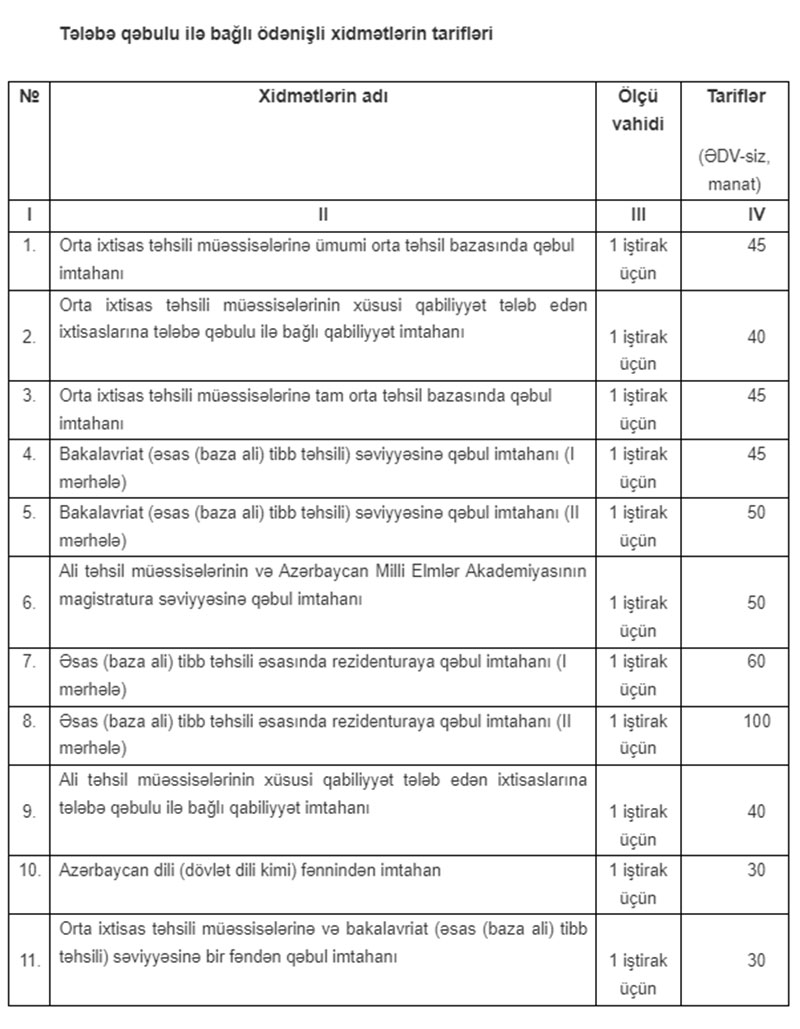 Orta ixtisas təhsili müəssisələrinə, ali təhsil müəssisələrinin bakalavriat səviyyəsinə, ali təhsil müəssisələrinin və Azərbaycan Milli Elmlər Akademiyasının magistratura səviyyəsinə və tibb təhsili üzrə rezidenturaya qəbul imtahanları, buraxılış imtahanları, həmçinin abituriyentlərin buraxılış imtahanı çərçivəsində əlavə verdikləri Azərbaycan dili (dövlət dili kimi), rus dili və coğrafiya fənləri üzrə fərq imtahanlarına dair, habelə ali və orta ixtisas təhsili müəssisələrinin xüsusi qabiliyyət tələb edən ixtisasları üzrə qabiliyyət imtahanları üzrə tarif tənzimlənməsi həyata keçirilib və yeni tarifləri müəyyənləşdirilib.