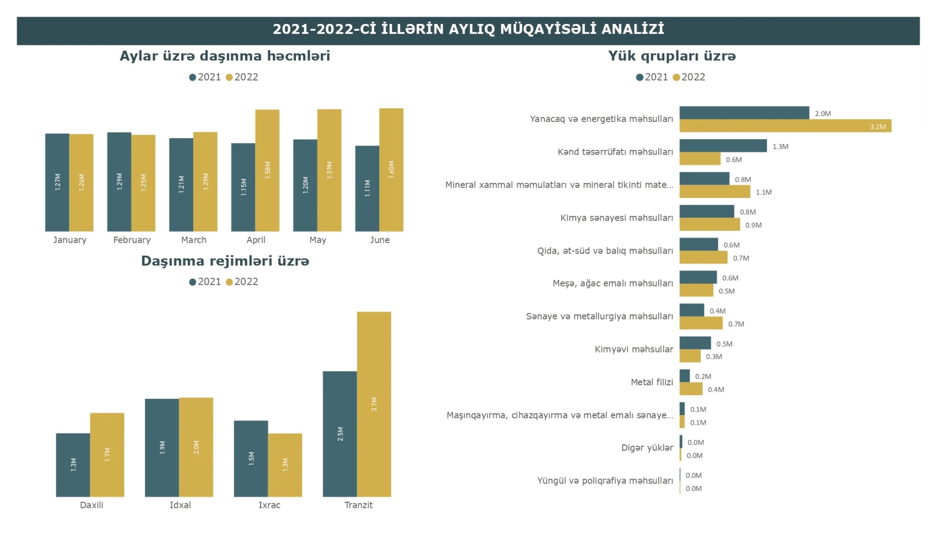 Daxili daşınmalar üzrə yanacaq və energetika məhsullar üzrə 94%, mineral xammal məmulatları və mineral tikinti materialları daşınmasında 37%, sənaye və metallurgiya məhsulları üzrə isə 2 dəfəyədək artım mövcuddur.