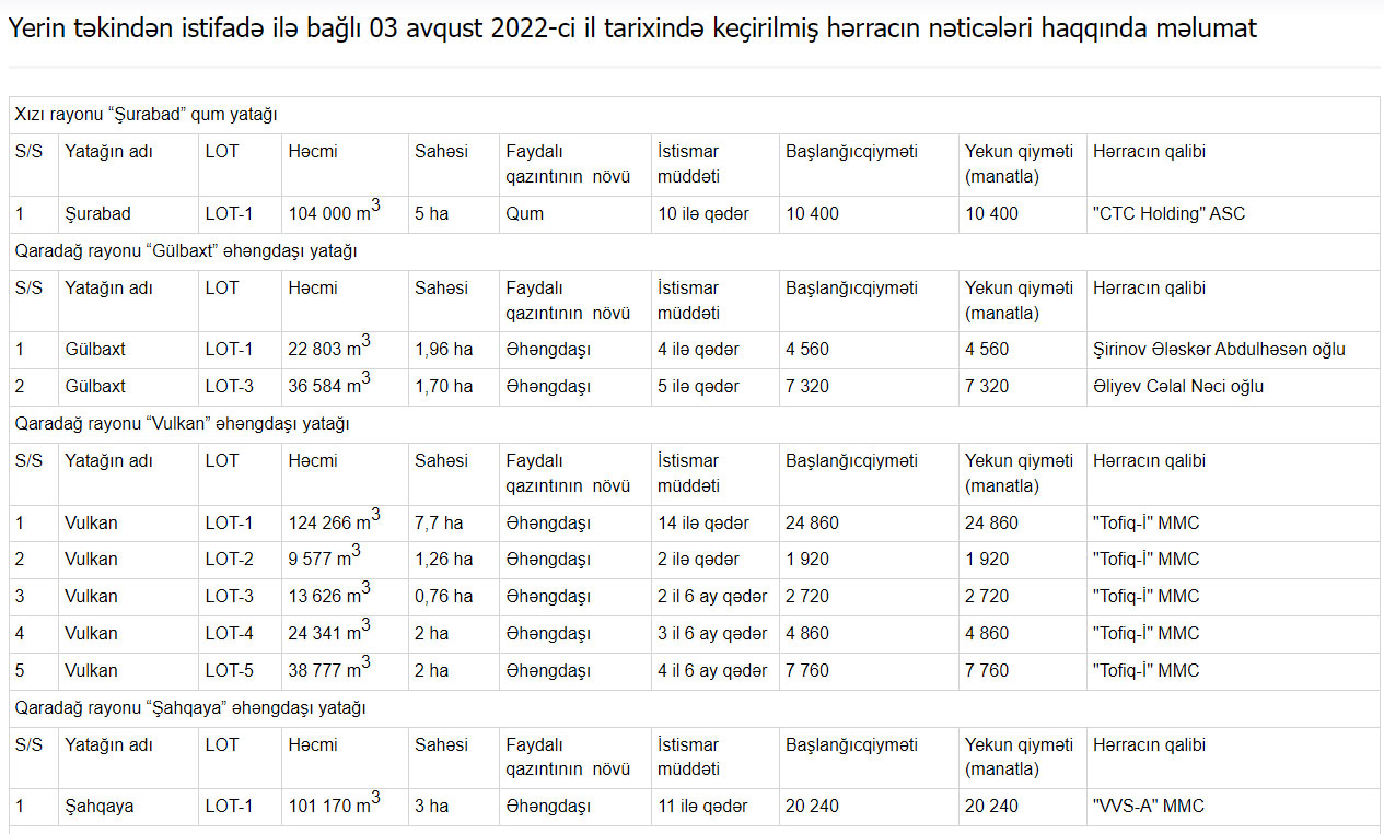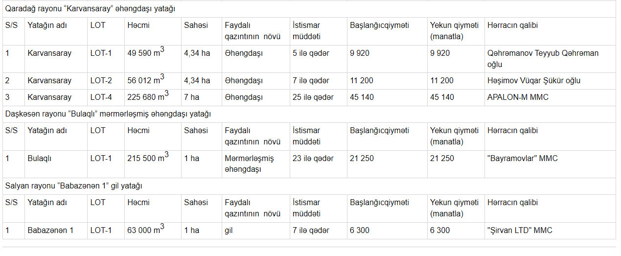 Faydalı qazıntı yataqlarının istifadəyə verilməsi ilə bağlı keçirilən növbəti hərracda Xızıda yerləşən “Şurabad” qum yatağının 5 hektar sahəsi, Qaradağda “Gülbaxt”, “Vulkan”, “Şahqaya”, “Karvansaray” əhəngdaşı yataqlarının müvafiq olaraq 3.66, 13.72, 3, 15.68 hektar sahəsi, Daşkəsəndə “Bulaqlı” mərmərləşmiş əhəngdaşı yatağının 1 hektar sahəsi və Salyanda “Babazənən 1” gil yatağının 1 hektar sahəsi istifadəyə verilib.