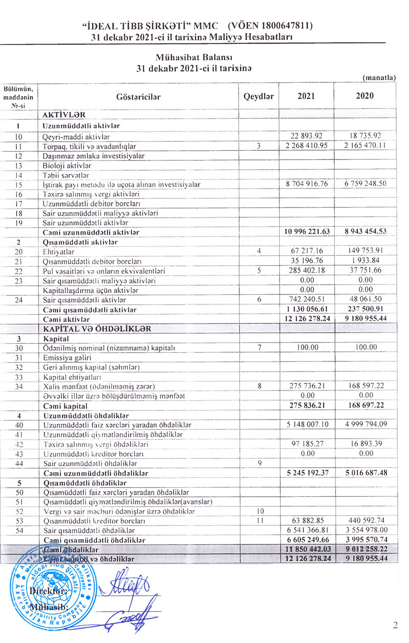 31 Dekabr 2021-ci il tarixində "İdeal Tibb Şirkəti" MMC 12 milyon 126 min manat cəmi aktivlərə malik olub. Şirkət 2020-ci ilin sonunda 9 milyon 181 min manat cəmi aktivlərə malik idi.