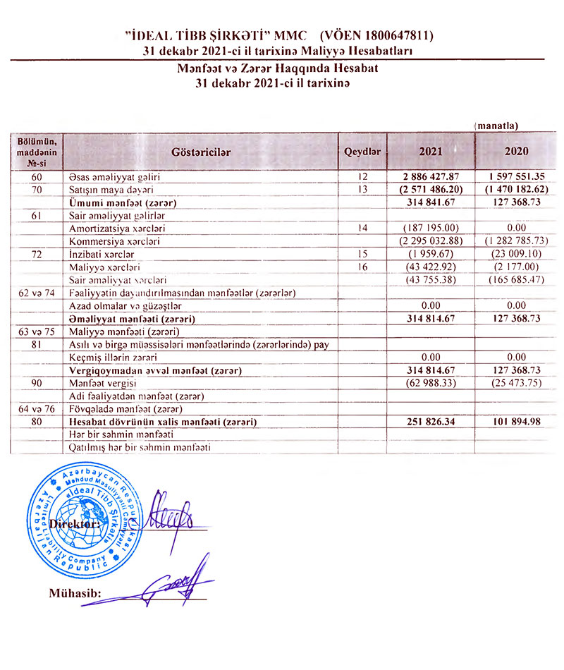 "Diamed Medical Group"a daxil olan "İdeal Tibb Şirkəti" MMC 2021-ci ili 252 min manat xalis mənfəət ilə başa vurub. Şirkət 2020-ci ili 102 min manat xalis mənfəət ilə bağlamışdı. Beləliklə,"İdeal Tibb Şirkəti"nin 2021-ci ildə xalis mənfəəti 2020-ci illə müqayisədə 2,5 dəfə artıb.