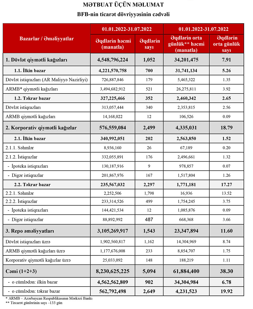 2022-ci ilin 7 ayında (01.01.2022-31.07.2022 tarixləri) Bakı Fond Birjasında ərzində qiymətli kağızlar üzrə keçirilən əməliyyatların ümumi həcmi 8 milyard 230 milyon 625 min manat təşkil edib. Xatırladaq ki, Bakı Fond Birjasında 2021-ci ilin yanvar-iyul ayları ərzində qiymətli kağızlar üzrə keçirilən əməliyyatların ümumi həcmi 9 milyard 468 milyon 754 min manat təşkil etmişdi. Beləliklə, əməliyyatların həcmi 1 milyard 238 milyon 128 min manat və ya 13% azalıb.