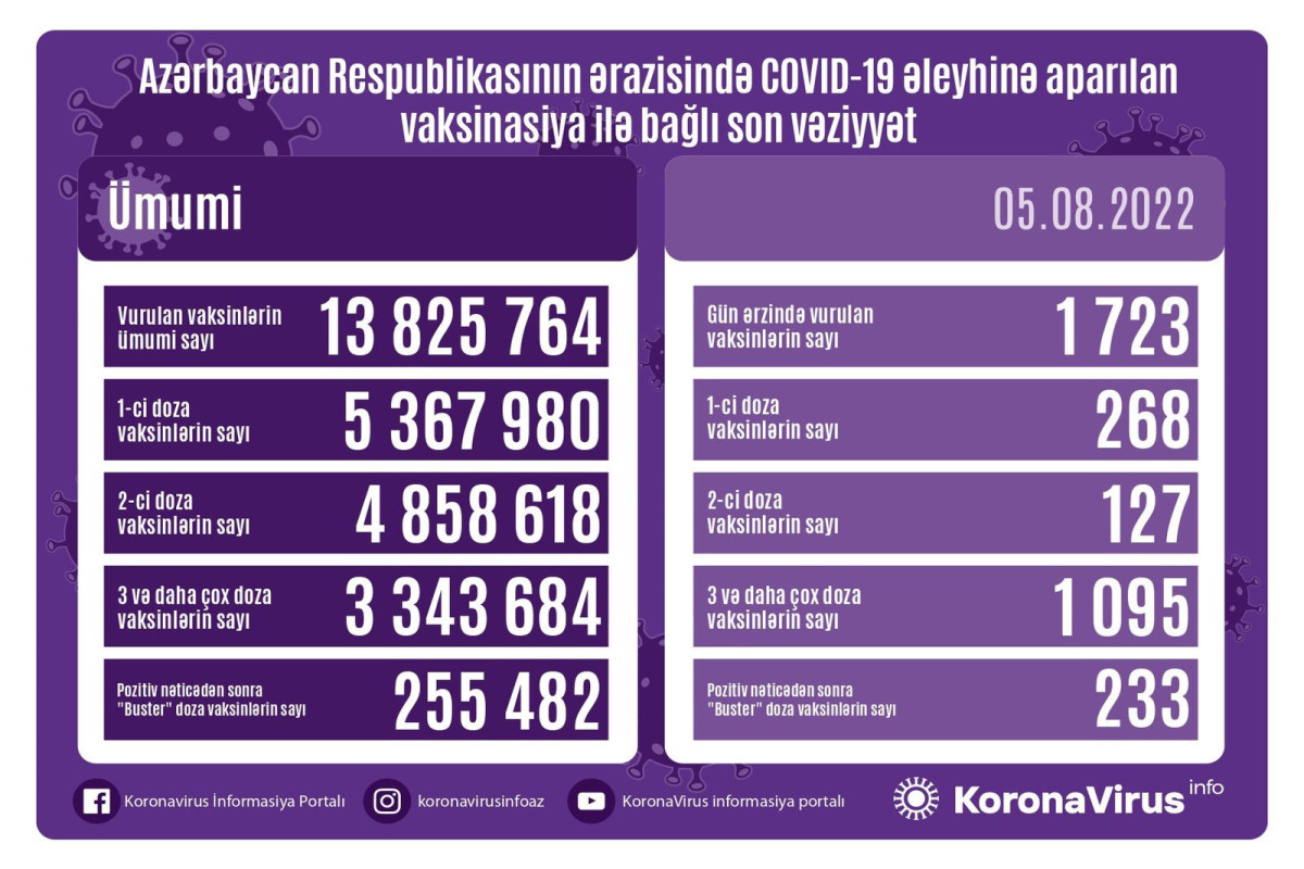 Azərbaycanda son sutkada koronavirus (COVID-19) əleyhinə 1 723 vaksin vurulub. Bir gündə birinci mərhələ üzrə vaksinasiya olunanların sayı 268, ikinci mərhələ üzrə vaksinasiya olunanların sayı 127, üç və daha çox doza üzrə vaksinasiya olunanların sayı 1 095, pozitiv nəticədən sonra buster doza üzrə vaksinasiya olunanların sayı 233 nəfərdir.