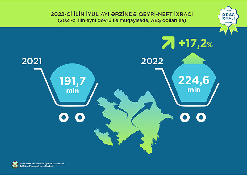 “İxrac icmalı”nın avqust sayına əsasən, 2022-ci ilin yanvar-iyul aylarında Azərbaycanın ümumi ixracı 22,6 milyard ABŞ dolları, qeyri-neft sektoru üzrə ixrac 1,7 milyard ABŞ dolları təşkil edib. Qeyri-neft sektoru üzrə ixrac 2021-ci ilin ilk yeddi ayı ilə müqayisədə 24,2% artıb.