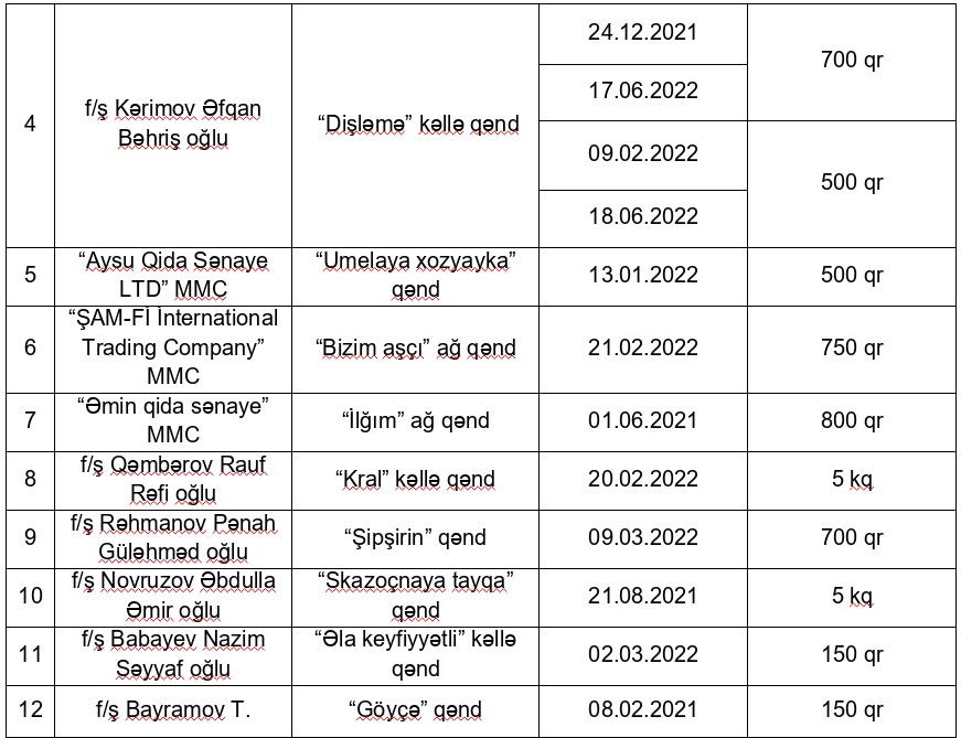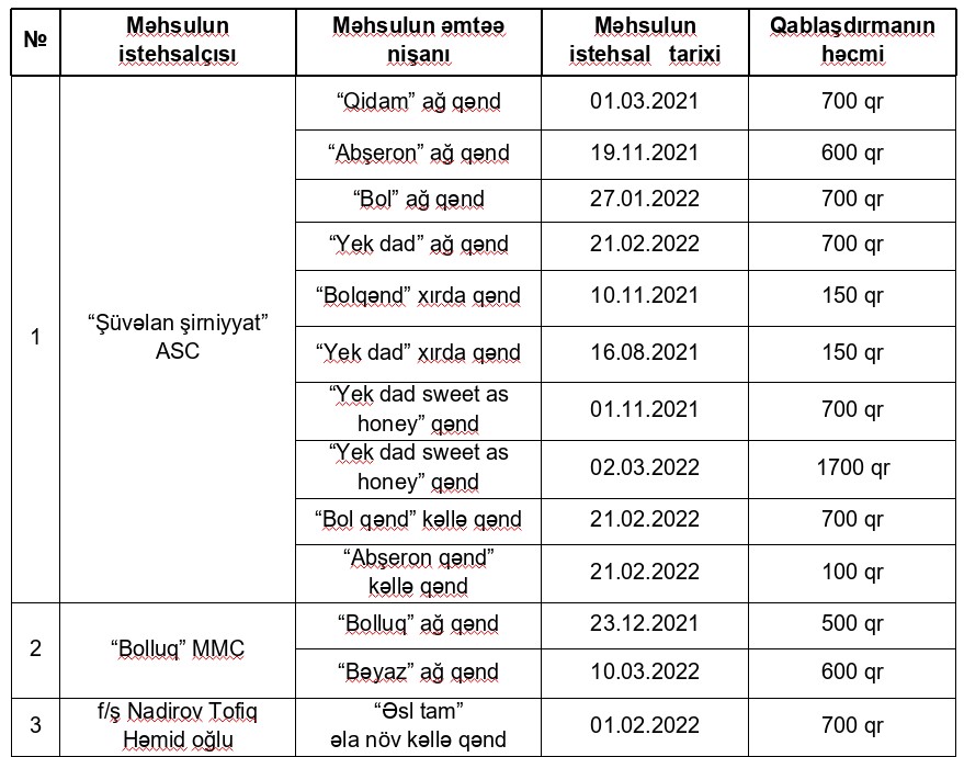 12 istehsalçının qənd məhsulları satışdan çıxarılır.Azərbaycan Respublikasının Qida Təhlükəsizliyi Agentliyi (AQTA) tərəfindən ölkə ərazisində qida təhlükəsizliyinin təmin olunması və əhalinin sağlamlığının qorunması istiqamətində monitorinqlər davam etdirilir.