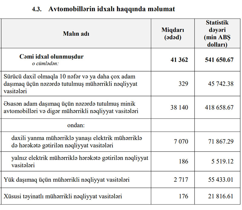 2022-ci ilin yanvar-iyul dövründə (7 ayda) Azərbaycana 541 milyon 650 min dollar dəyərində 41 min 362 ədəd avtomobil (nəqliyyat vasitələri) idxal edilib.