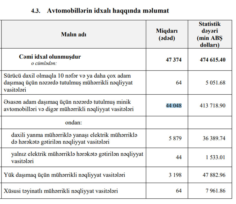 2021-ci ilin 7 ayında Azərbaycana 474 milyon 615 min dollar dəyərində 47 min 374 ədəd avtomobil idxal edilmişdi.