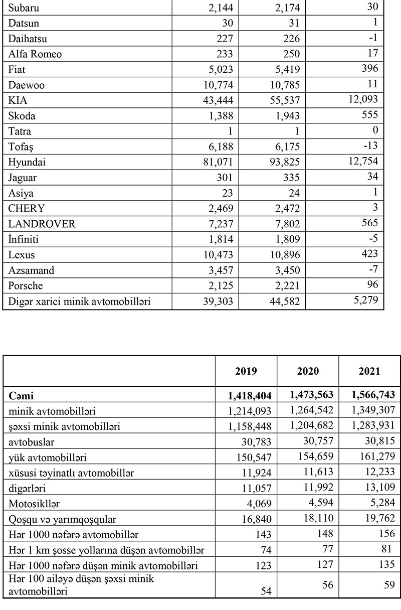 Ötən il Azərbaycan vətəndaşları ən çox Toyota və Hyundai avtomobilləri alıblar.2021-ci ildə Azərbaycanda nəqliyyat vasitələrinin sayı 93 min 180 ədəd artaraq 1 milyon 566 min 743 ədədə çatıb. 2020-ci ildə nəqliyyat vasitələrinin sayı 55 min 159 ədəd artaraq 1 milyon 473 min 563 ədədə çatmışdı.