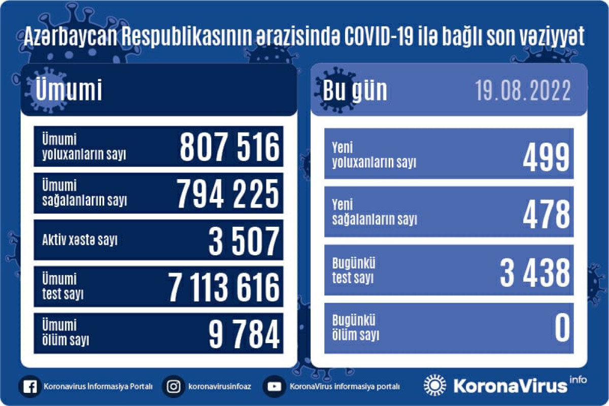 Azərbaycanda koronavirus (COVID-19) infeksiyasına 499 yeni yoluxma faktı qeydə alınıb, 478 nəfər müalicə olunaraq sağalıb.