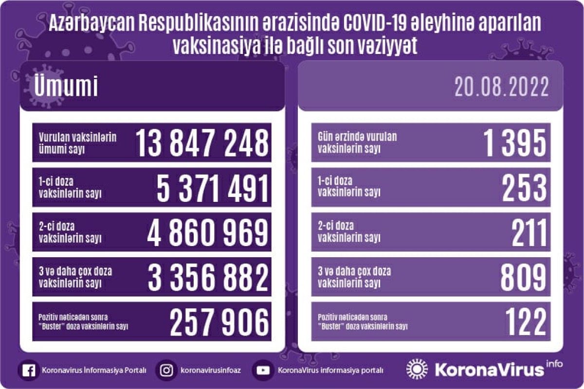 Azərbaycanda son sutkada koronavirus (COVID-19) əleyhinə 1395 vaksin vurulub. Bir gündə birinci mərhələ üzrə vaksinasiya olunanların sayı 253, ikinci mərhələ üzrə vaksinasiya olunanların sayı 211, üç və daha çox doza vaksin vurduranların sayı 809, pozitiv nəticədən sonra buster doza üzrə vaksinasiya olunanların sayı isə 122 nəfərdir.