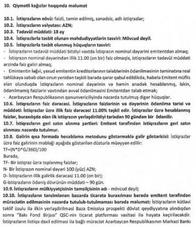 Marja xəbər verir ki, istiqraz buraxılışı hər birinin nominal dəyəri 100 manat olan 10 min ədəd qiymətli kağızdan ibarətdir.