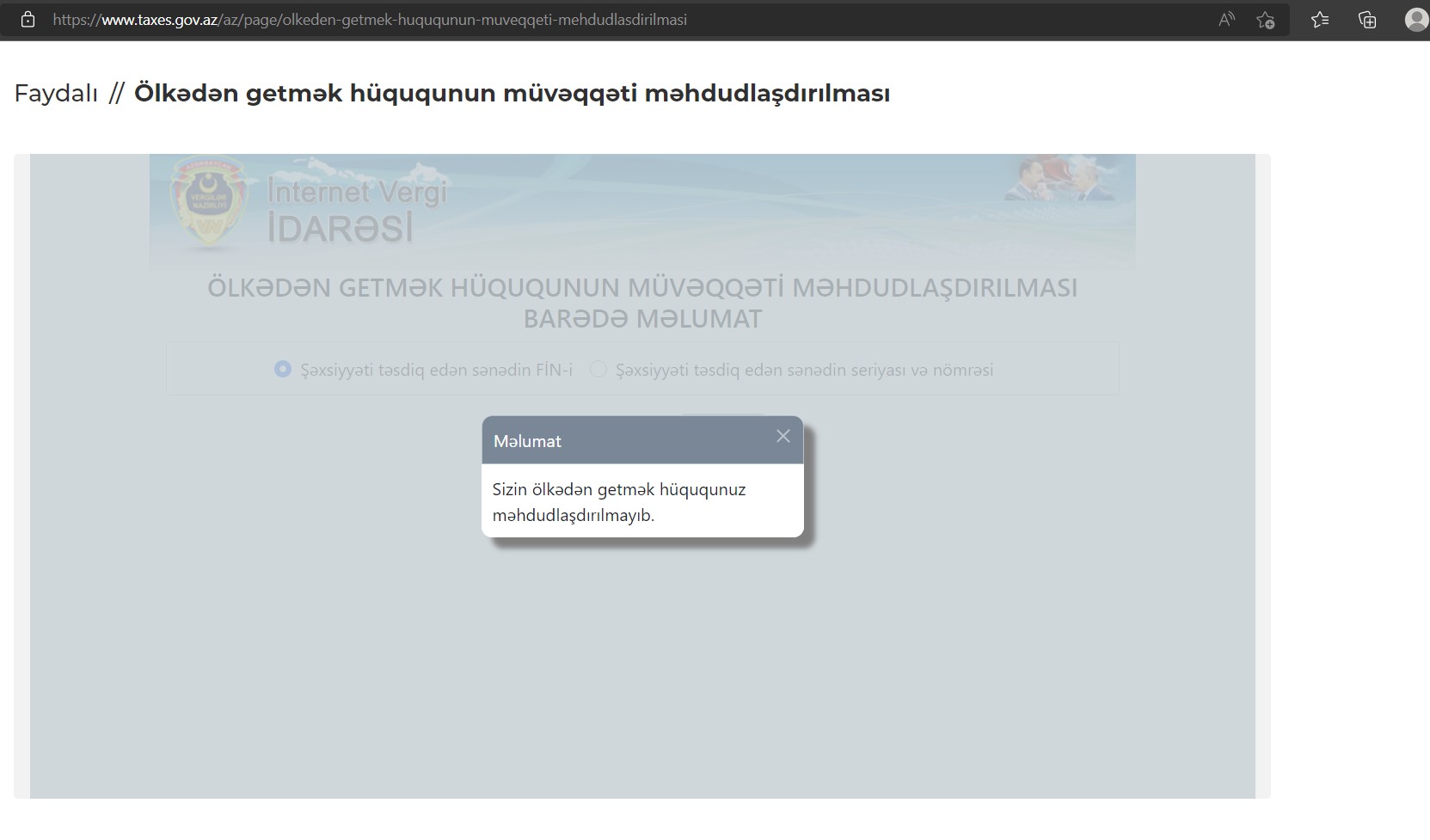 "Baş direktorun ölkədən çıxışına qadağa qoyulması haqqında yayılan məlumatlar həqiqəti əks etdirmir. (link: https://www.taxes.gov.az/az/page/olkeden-getmek-huququnun-muveqqeti-mehdudlasdirilmasi FİN: 1K87CJ7) AR Dövlət Vergi Xidmətinin rəsmi saytından istənilən şəxs yoxlaya bilər.