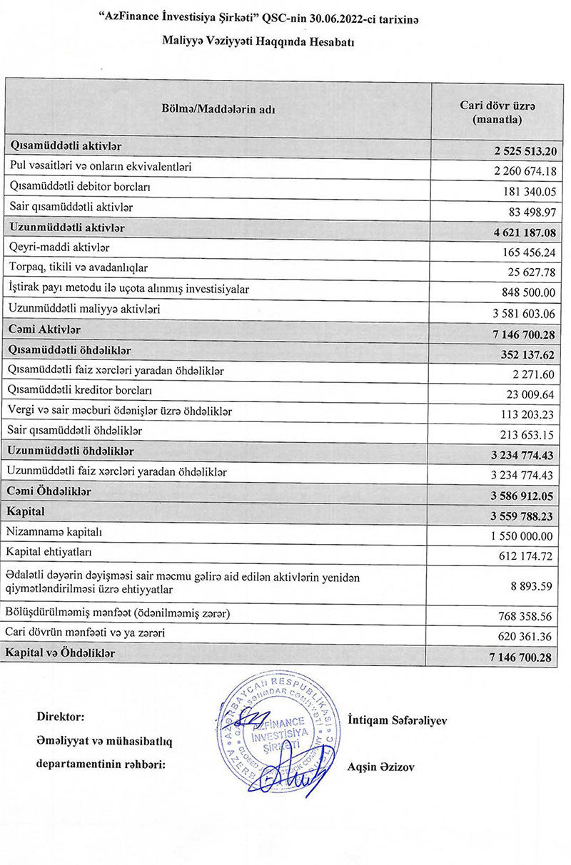 "AzFinance İnvestisiya Şirkəti" QSC 2022-ci ilin birinci yarısını 620 min 360 manat xalis mənfəət ilə başa vurub.