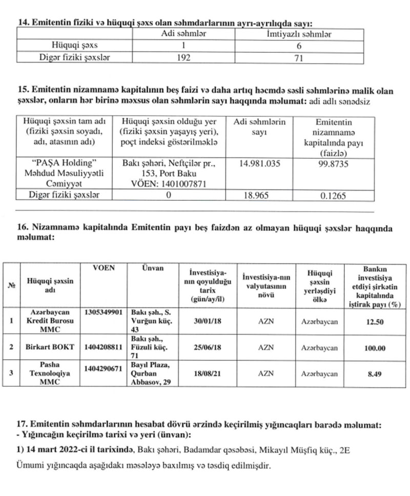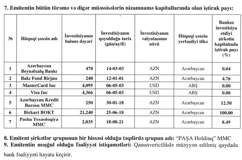 “Kapital Bank” ASC onunla birlikdə “PAŞA Holdinq” MMC-yə daxil olan “PASHA Technology” MMC-nin nizamnamə kapitalındakı payını 1,36 faiz bəndi azaldaraq 9,85%-dən 8,49%-ə endirib.