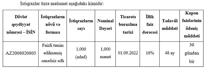 Faizli təmin edilməmiş sənədsiz adlı istiqrazların sayı 1000 manat, hər birinin nominal dəyəri 1000 manat, illik faiz dərəcəsi 16%, tədavül müddəti 48 ay, kupon faizlərinin ödəniş müddəti 30 gündən birdir.