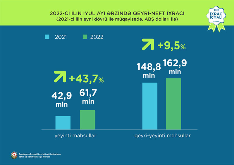 İqtisadi İslahatların Təhlili və Kommunikasiya Mərkəzinin təqdim etdiyi “İxrac icmalı”nın avqust sayına əsasən, 2022-ci ilin yanvar-iyul aylarında Azərbaycanın ümumi ixracı 22,6 milyard ABŞ dolları, qeyri-neft sektoru üzrə ixrac 1,7 milyard ABŞ dolları təşkil edib. Qeyri-neft sektoru üzrə ixrac 2021-ci ilin ilk yeddi ayı ilə müqayisədə 24,2% artıb.
