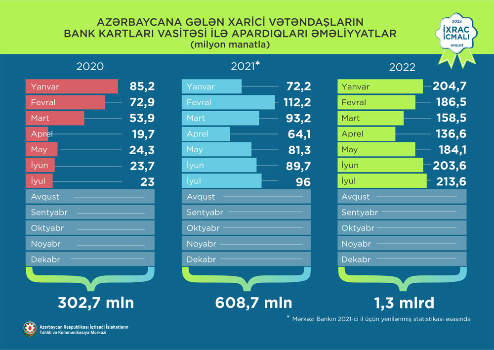 Marja.az 2022-ci ilin yanvar-iyul ayları üzrə“İxrac İcmalı”na istinadən xəbər verir ki, 2022-ci ilin yanvar-iyul aylarında isə əcnəbilər bank kartları vasitəsi ilə 1,3 milyard manatlıq əməliyyat aparıblar