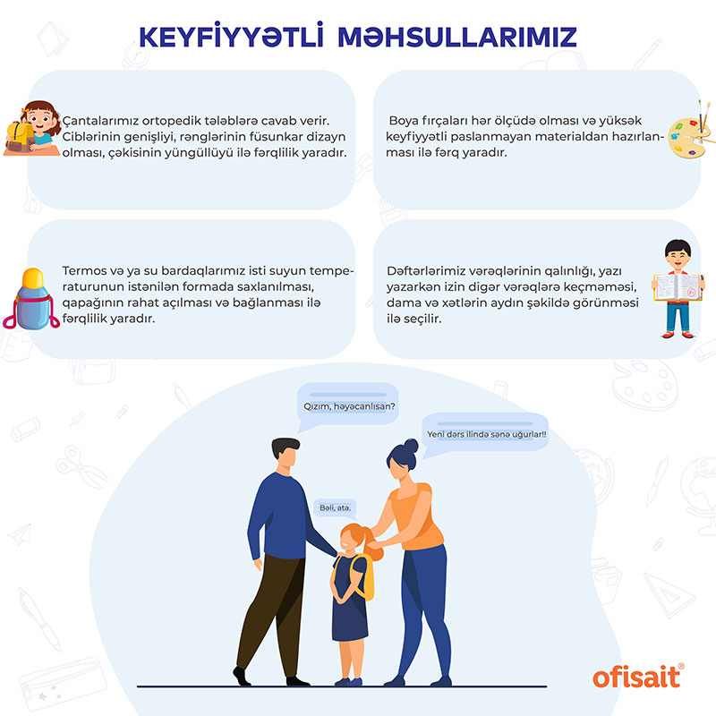 Övladlarınıza keyfiyyətli və sərfəli məhsulları “Ofisait” mağazalar şəbəkəsindən əldə edə bilərsiniz.