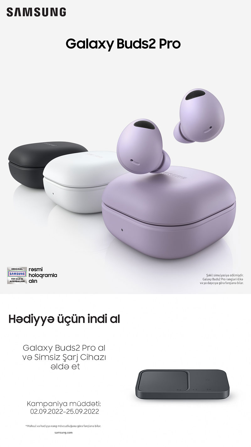 Qeyd etmək istərdik ki, qulaqlıqlar artıq Samsungun Azərbaycandakı rəsmi distribyutorlarından satışdadır. Sentyabrın 25-nə qədər Galaxy Buds2 Pro-nu əldə edən hər bir şəxs Simsiz Şarj Cihazını da əldə edəcək.