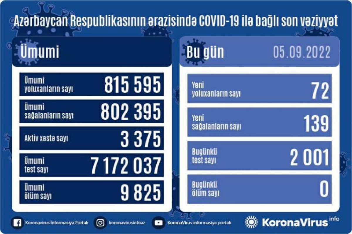 Azərbaycan Respublikasında koronavirus (COVID-19) infeksiyasına 72 yeni yoluxma faktı qeydə alınıb,139 nəfər müalicə olunaraq sağalıb.