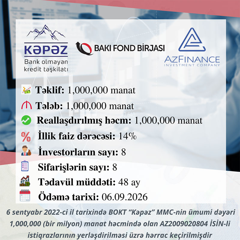 Xəbər verdiyimiz kimi, 1 sentyabr 2022-ci il tarixində Bakı Fond Birjasında BOKT “Kəpəz” MMC-nin tədavül müddəti 48 ay olan AZ2008020805 dövlət qeydiyyat nömrəli, 1 milyon manat həcmində, faizli, təmin edilməmiş sənədsiz, adlı istiqrazlarının yerləşdirilməsi üzrə hərrac yekunlaşmış, hərrac zamanı 1 investor tərəfindən 1 sifariş təqdim edilmişdi. Sifarişin nominal qiymətlə ümumi məbləği 1 milyon manat, yerləşdirilmiş həcmi də 1 milyon manat təşkil etmişdi. İstiqrazın illik faiz dərəcəsi 16%, faiz ödənişləri isə hər 90 gündə bir dəfə olmaqla investorlara ödənilir. İstiqrazların ödəmə tarixi 01.09.2026-cı ildir.