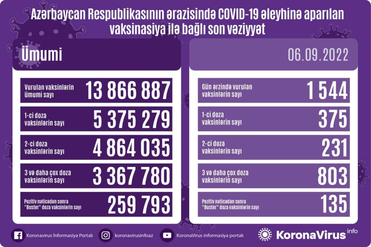 Azərbaycanda son sutkada koronavirus (COVID-19) əleyhinə 1 544 vaksin vurulub. Bir gündə birinci mərhələ üzrə vaksinasiya olunanların sayı 375, ikinci mərhələ üzrə vaksinasiya olunanların sayı 231, üç və daha çox doza üzrə vaksinasiya olunanların sayı 803, pozitiv nəticədən sonra buster doza üzrə vaksinasiya olunanların sayı 135 nəfərdir.