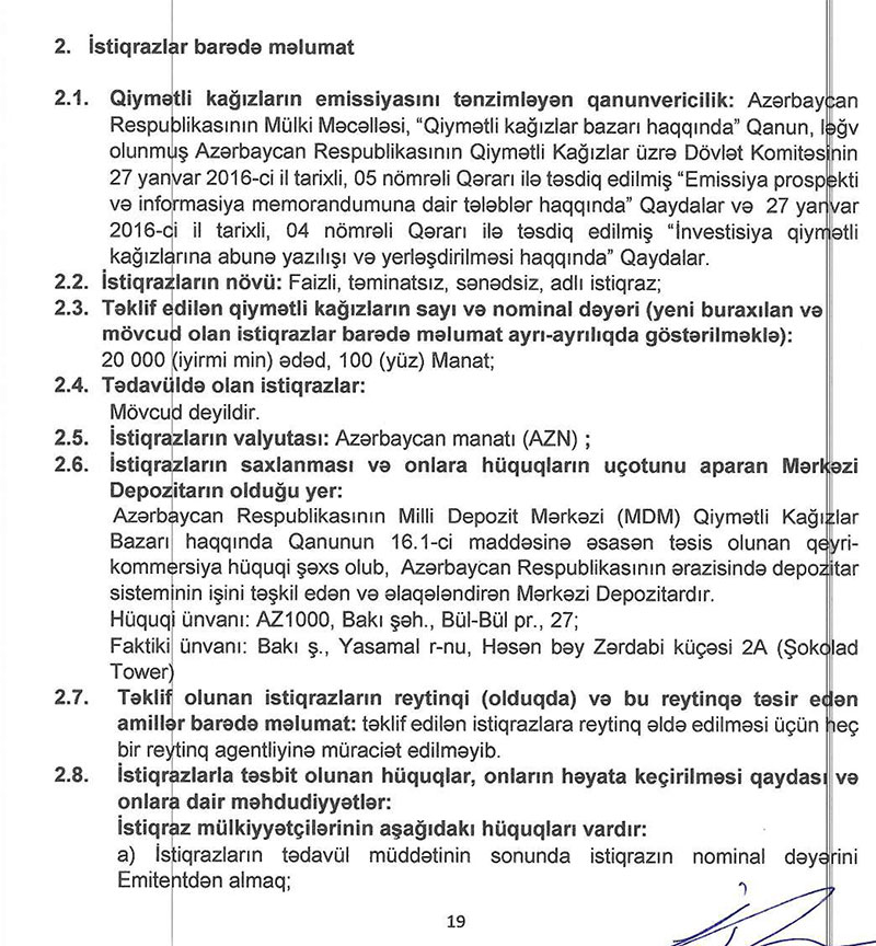Marja.az xəbər verir ki, istiqraz buraxılışı hər birinin nominal dəyəri 100 manat olan faizli, təmiatsız, sənədsiz və adlı 20 000 ədəd istiqrazdan ibaərtdir.