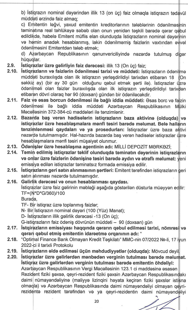 "Optimal Finance Bank Olmayan Kredit Təşkilatı" MMC 2 milyon manatlıq itiqraz buraxır.