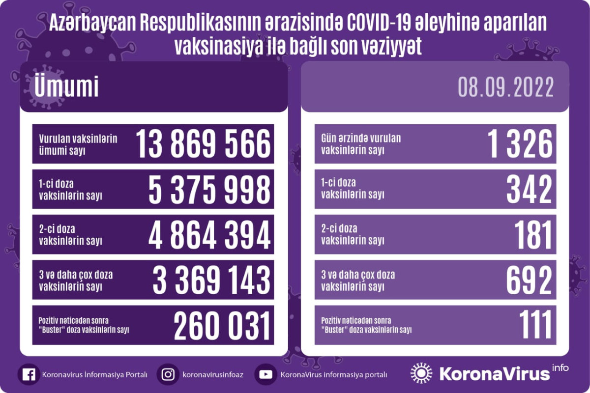 Azərbaycanda son sutkada koronavirus (COVID-19) əleyhinə 1326 vaksin vurulub. Bir gündə birinci mərhələ üzrə vaksinasiya olunanların sayı 342, ikinci mərhələ üzrə vaksinasiya olunanların sayı 181, üç və daha çox doza üzrə vaksinasiya olunanların sayı 692, pozitiv nəticədən sonra buster doza üzrə vaksinasiya olunanların sayı 111 nəfərdir.
