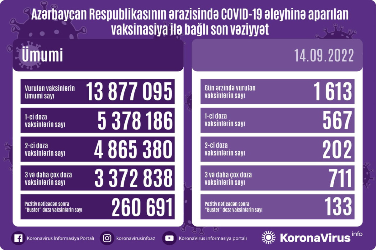 Azərbaycanda son sutkada koronavirus (COVID-19) əleyhinə 1 613 vaksin vurulub. Bir gündə birinci mərhələ üzrə vaksinasiya olunanların sayı 567, ikinci mərhələ üzrə vaksinasiya olunanların sayı 202, üç və daha çox doza üzrə vaksinasiya olunanların sayı 711, pozitiv nəticədən sonra buster doza üzrə vaksinasiya olunanların sayı 133 nəfərdir.
