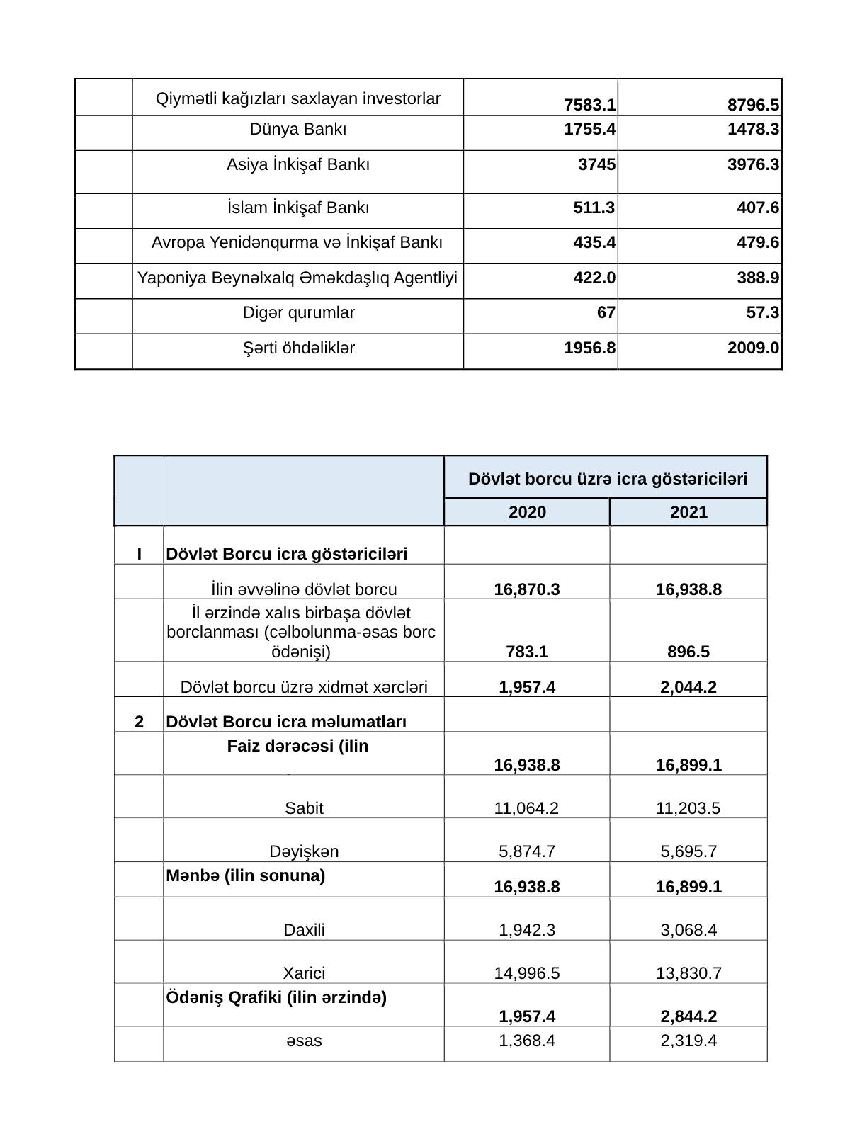 01 yanvar 2022-ci il tarixinə Azərbaycanın xarici və daxili dövlət bocu 16 milyard 899.1 milyon manat təşkil etmişdi.
