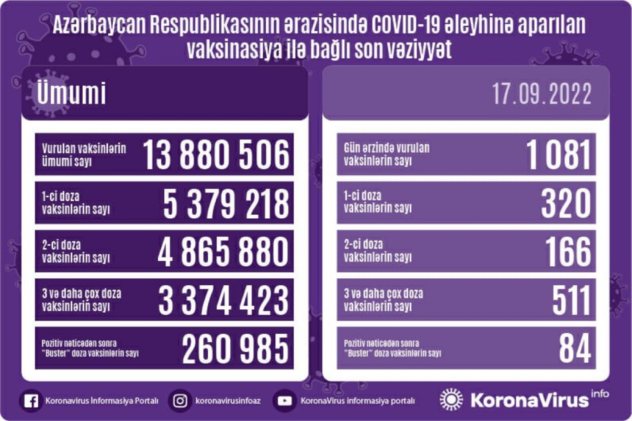 Azərbaycanda son sutkada koronavirus (COVID-19) əleyhinə 1 081 vaksin vurulub. Bir gündə birinci mərhələ üzrə vaksinasiya olunanların sayı 320, ikinci mərhələ üzrə vaksinasiya olunanların say 166, üç və daha çox doza üzrə vaksinasiya olunanların sayı 511, pozitiv nəticədən sonra buster doza üzrə vaksinasiya olunanların sayı 84 nəfərdir.