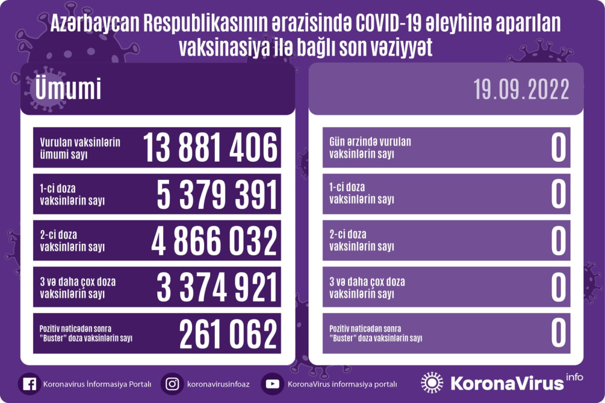 Azərbaycanda son sutkada koronavirus (COVID-19) əleyhinə vaksin vurulmayıb. Nazirlər Kabineti yanında Operativ Qərargahdan verilən xəbərə görə, bir gündə heç bir mərhələ üzrə vaksinasiya aparılmayıb.