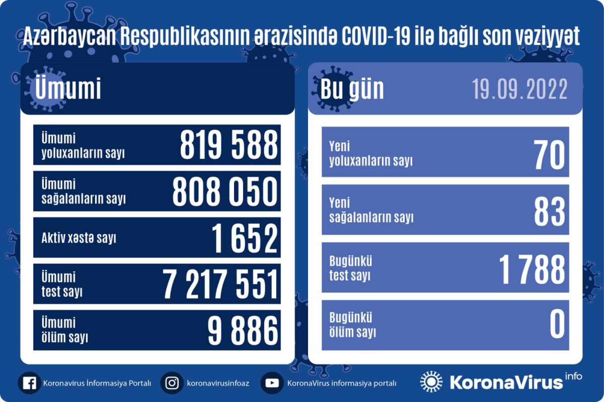 Azərbaycan Respublikasında koronavirus (COVID-19) infeksiyasına 70 yeni yoluxma faktı qeydə alınıb, 83 nəfər müalicə olunaraq sağalıb.