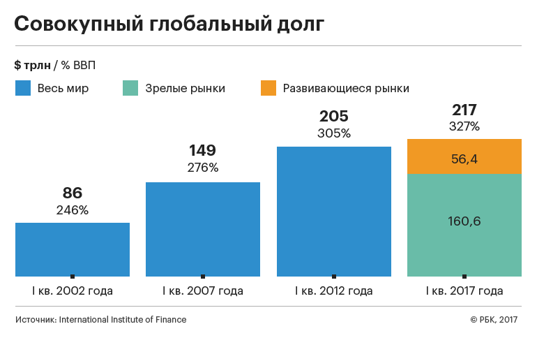 Qlobal borc yükü artır. 2017-cu ilin birinci rübündə dünya üzrə borcun məbləği yeni rekord həddə qalxaraq 217 trilyon dollar təşkil edib.