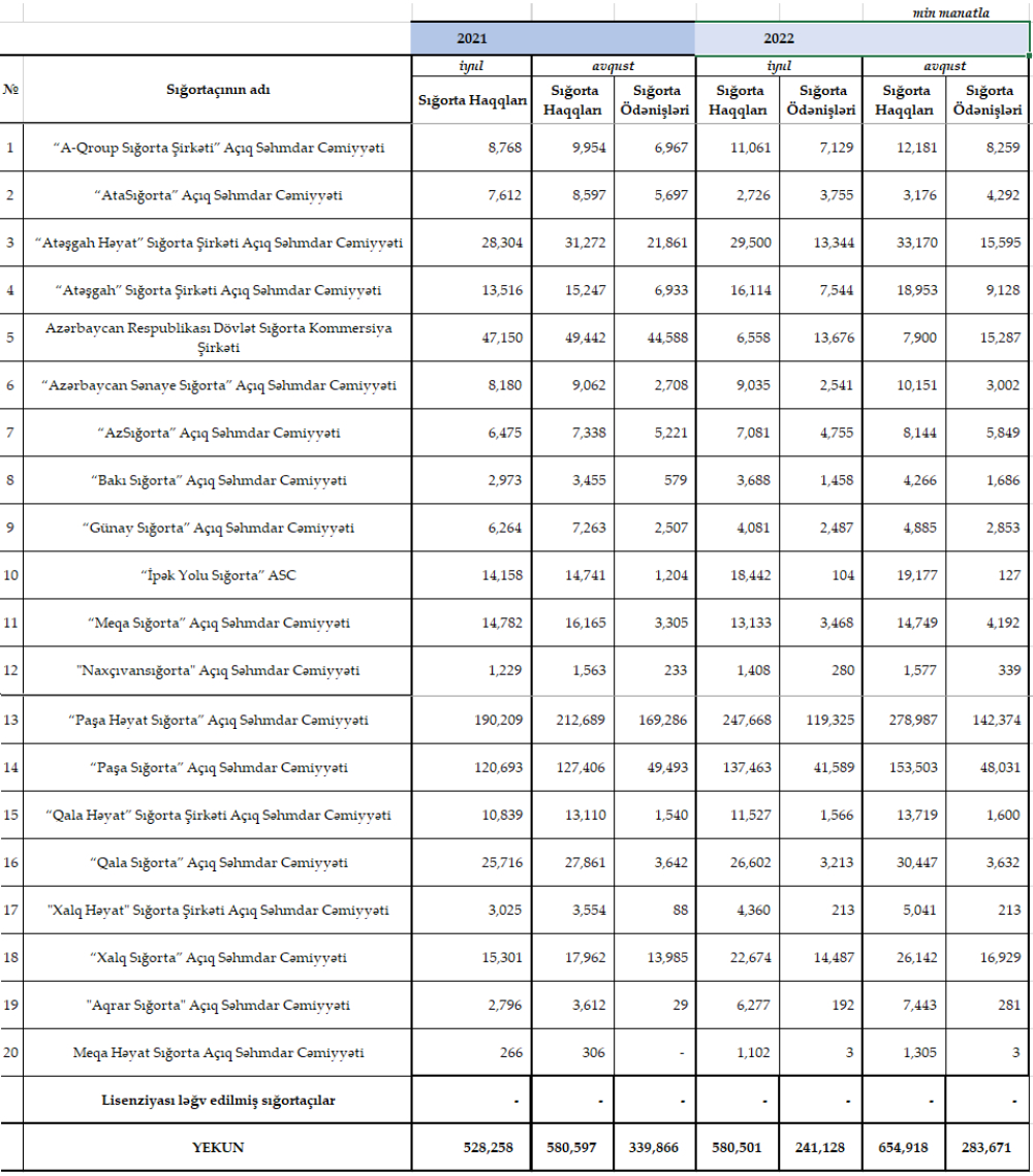 2022-ci ilin 8 ayı ərzində (yanvar-avqust) "Ata Sığorta", "Azərsığorta" (Dövlət Sığorta Kommersiya Şirkəti), "Günay Sığorta" və "Meqa Sığorta" şirkətlərinin hesabladıqları sığorta haqları azalıb.