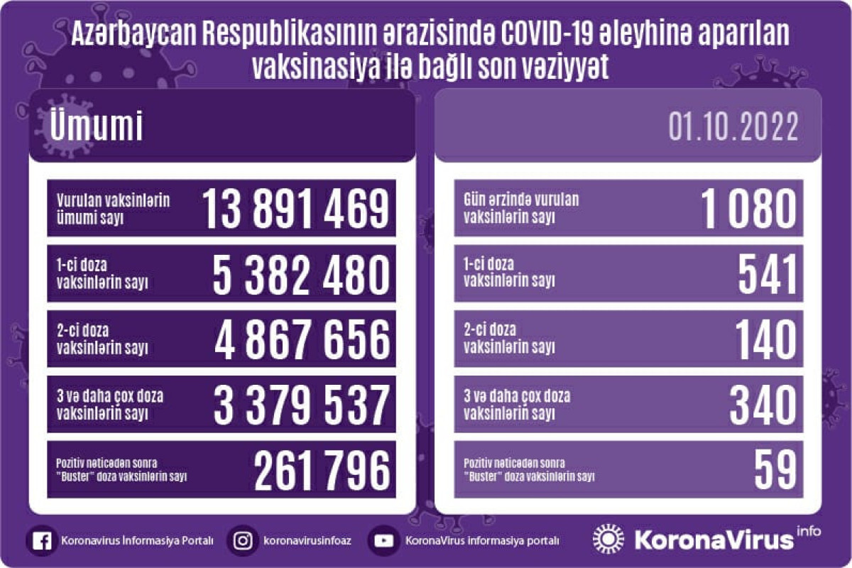 Azərbaycanda son sutkada koronavirus (COVID-19) əleyhinə 1080 vaksin vurulub. Nazirlər Kabineti yanında Operativ Qərargahdan APA-ya verilən məlumata görə, bir gündə birinci mərhələ üzrə vaksinasiya olunanların sayı 541, ikinci mərhələ üzrə vaksinasiya olunanların sayı 140, üç və daha çox doza üzrə vaksinasiya olunanların sayı 340, pozitiv nəticədən sonra buster doza üzrə vaksinasiya olunanların sayı 59 nəfərdir.