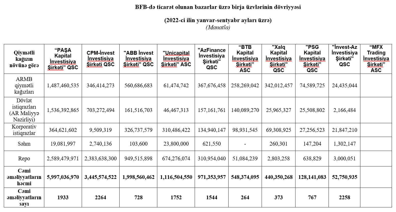 Marja xəbər verir ki, “PAŞA Kapital İnvestisiya Şirkəti” QSC 5 milyard 997 milyon 37 min manat dövriyyə ilə 1-ci, CPM-İnvest İnvestisiya Şirkəti QSC 3 milyard 445 milyon 574 min manat dövriyyə ilə 2-ci və "ABB İnvest İnvestisiya Şirkəti" QSC 1 milyard 998 milyon 560 min manat dövriyyə ilə 3-cü yeri tutub.
