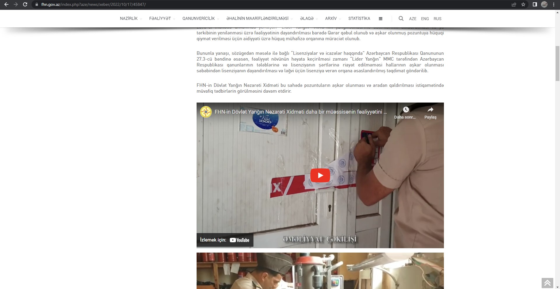 Bununla yanaşı, sözügedən məsələ ilə bağlı “Lisenziyalar və icazələr haqqında” Azərbaycan Respublikası Qanununun 27.3-cü bəndinə əsasən, fəaliyyət növünün həyata keçirilməsi zamanı “Lider Yanğın” MMC tərəfindən Azərbaycan Respublikası qanunlarının tələblərinə və lisenziyanın şərtlərinə riayət edilməməsi hallarının aşkar olunması səbəbindən lisenziyanın dayandırılması və ləğvi üçün lisenziya verən orqana əsaslandırılmış təqdimat göndərilib.