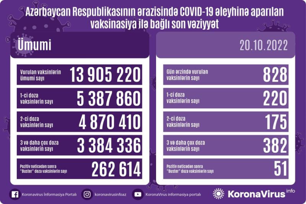 Azərbaycanda son sutkada koronavirus (COVID-19) əleyhinə 828 vaksin vurulub. Bir gündə birinci mərhələ üzrə vaksinasiya olunanların sayı 220, ikinci mərhələ üzrə vaksinasiya olunanların sayı 175, üç və daha çox doza üzrə vaksinasiya olunanların sayı 382, pozitiv nəticədən sonra buster doza üzrə vaksinasiya olunanların sayı 51 nəfərdir.