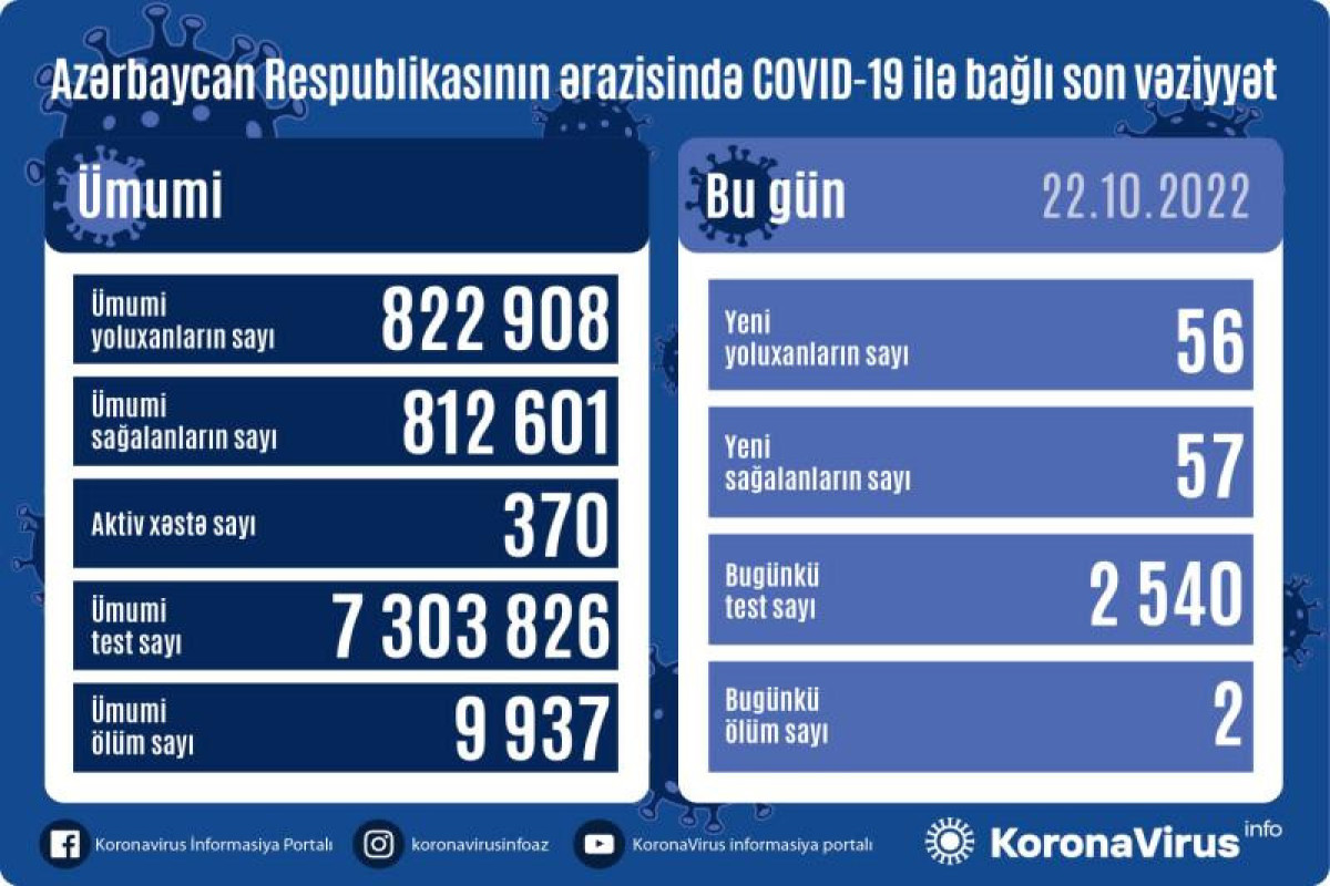 Azərbaycan Respublikasında koronavirus (COVID-19) infeksiyasına 56 yeni yoluxma faktı qeydə alınıb, 57 nəfər müalicə olunaraq sağalıb.