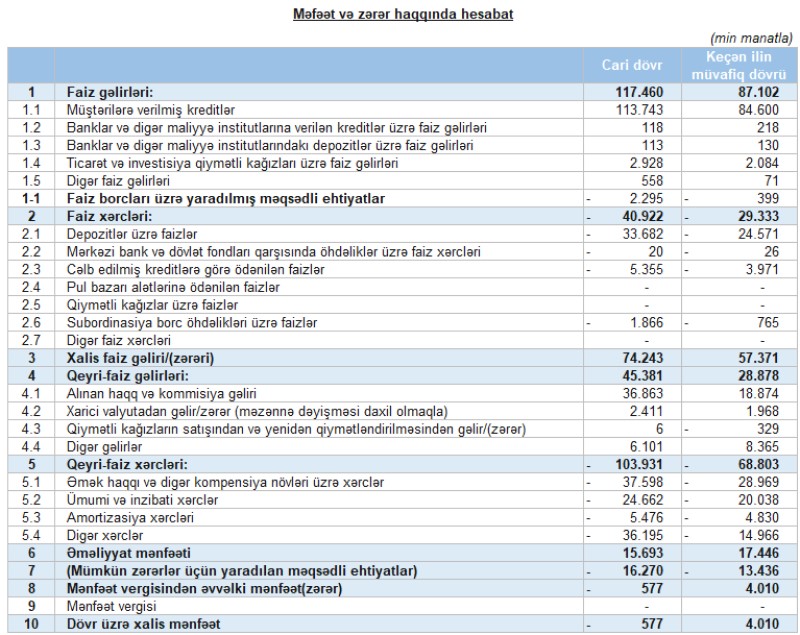 Hesabat dövrü ərzində Bankın məcmu gəlirlərində ciddi artım qeydə alınıb. 9 ay ərzində cəmi gəlirləri ötən ilin müvafiq dövrü ilə müqayisədə 40 % artaraq, 163 milyon manat təşkil edib. Beləliklə, 9 aylıq dövrün nəticələrinə görə faiz gəlirləri 118 milyon manat, qeyri-faiz gəlirləri isə 45 milyon təşkil edib. Bununla da Bankın qeyri-faiz gəlirləri ötən ilin uyğun dövrü ilə müqayisədə 57%, faiz gəlirləri isə 35% artıb. Cari dövrdə bankın əməliyyat mənfəət göstəricisi 16 milyon manat təşkil edib.