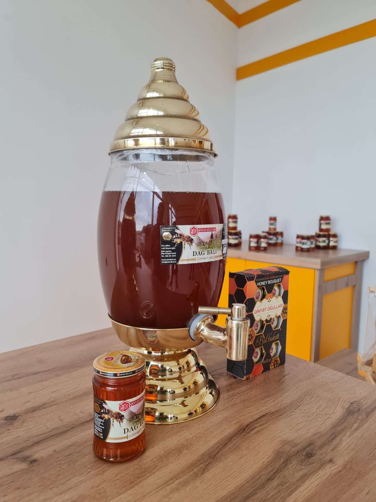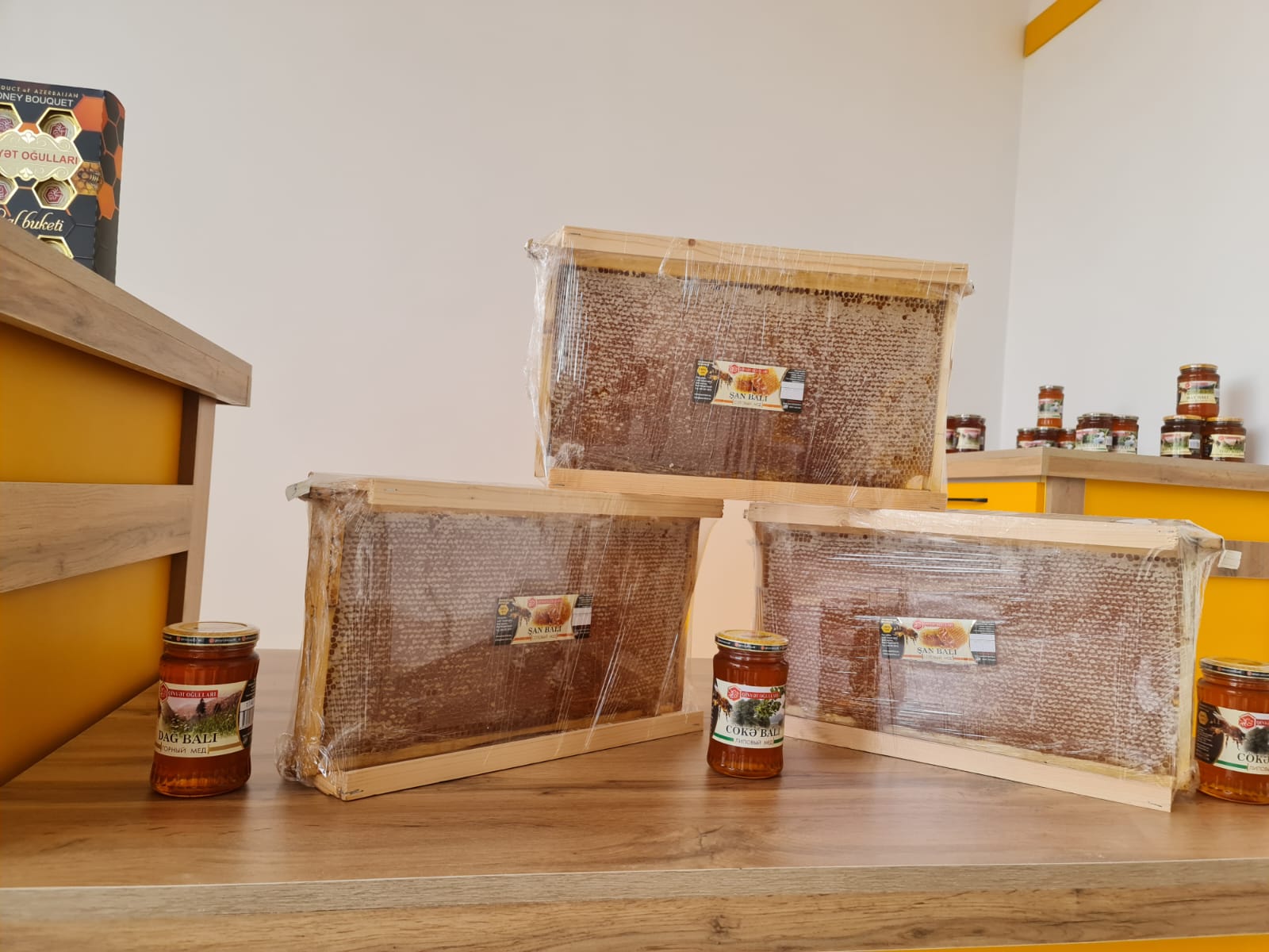 Mağazada "Qinyətoğulları" istehsalı olan müxtəlif bal çeşidləri, arı südü güləmi, çiçək tozu, vərəmum, külçə mum kimi arıçılıq məhsulları müştərilərə təklif ediləcək.