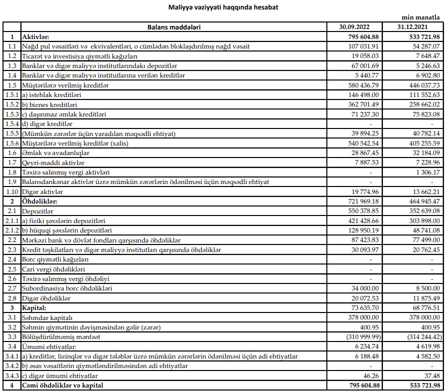 30 Sentyabr 2022-ci il tarixində "Yelo Bank" ASC 795 milyon 604 min manat cəmi aktivlərə malik olub. Bank 2021-ci ilin sonunda 533 milyon 721 min manat cəmi aktivlərə malik idi.