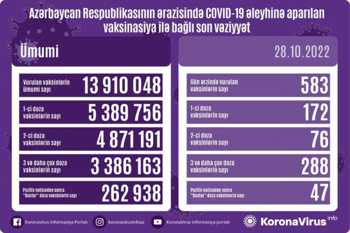 Azərbaycanda son sutkada koronavirus (COVID-19) əleyhinə 583 vaksin vurulub. Bir gündə birinci mərhələ üzrə vaksinasiya olunanların sayı 172, ikinci mərhələ üzrə vaksinasiya olunanların sayı 76, üç və daha çox doza üzrə vaksinasiya olunanların sayı 288, pozitiv nəticədən sonra buster doza üzrə vaksinasiya olunanların sayı 47 nəfərdir.